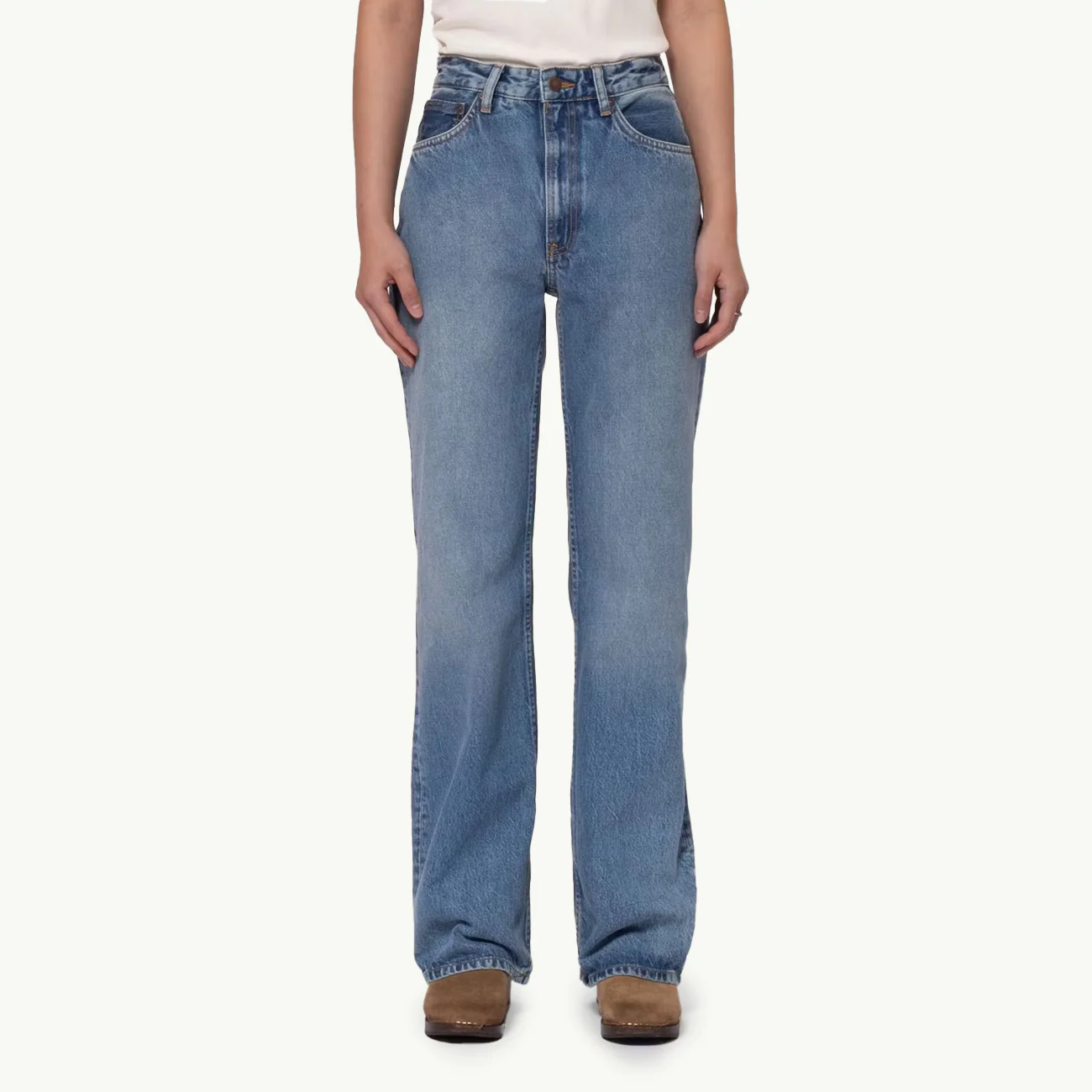 A loose, high-waist fit with a wide leg. This is a perfect display of what you’d get if you wore your favorite stonewashed jeans long enough. Clear blue and clean with authentic wear in all the right places. There are beautiful contrasts between marbled and flat areas with heaps of patina and defined twill lines.