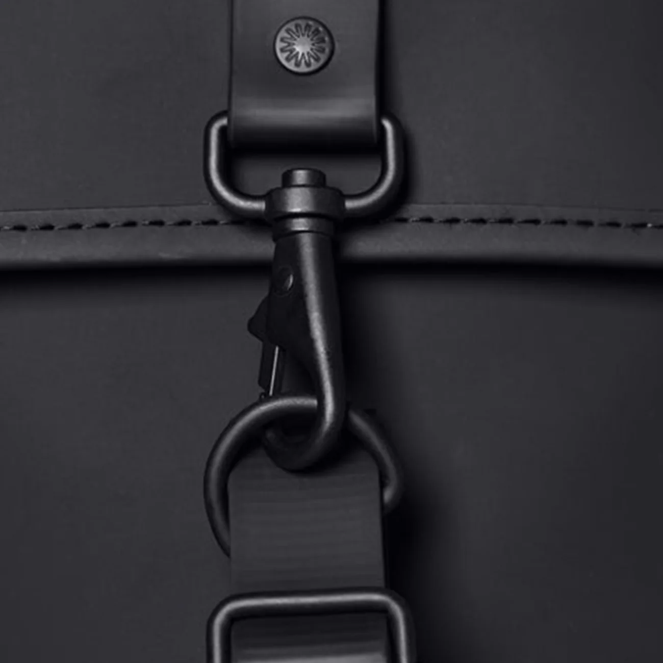 Backpack is cut in Rains’ signature waterproof PU fabric, engineered for carrying strength, durability, and a smooth feel.