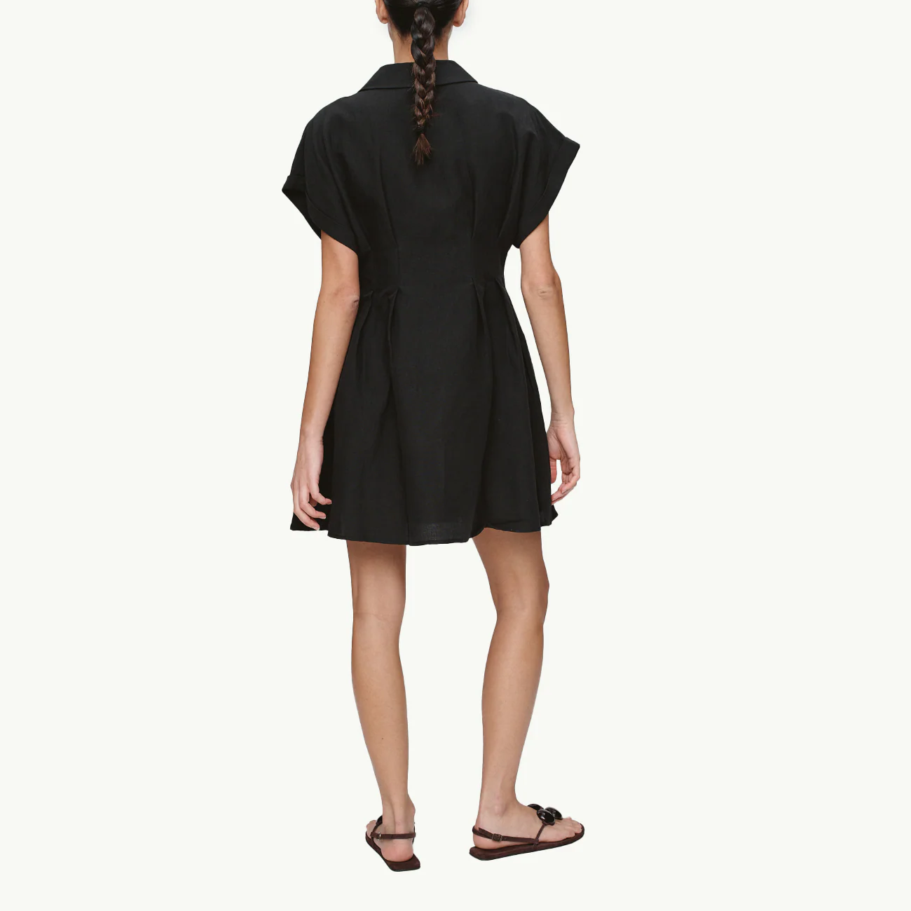 A mini length dress constructed from a linen / cotton cloth. Features a clean, deep-V neckline, wide short sleeves and a full button-through front closure. Includes side seam pockets for functionality and pleat detailing at the front for controlled volume and ease of movement. Designed for a relaxed fit that drapes from the shoulder.