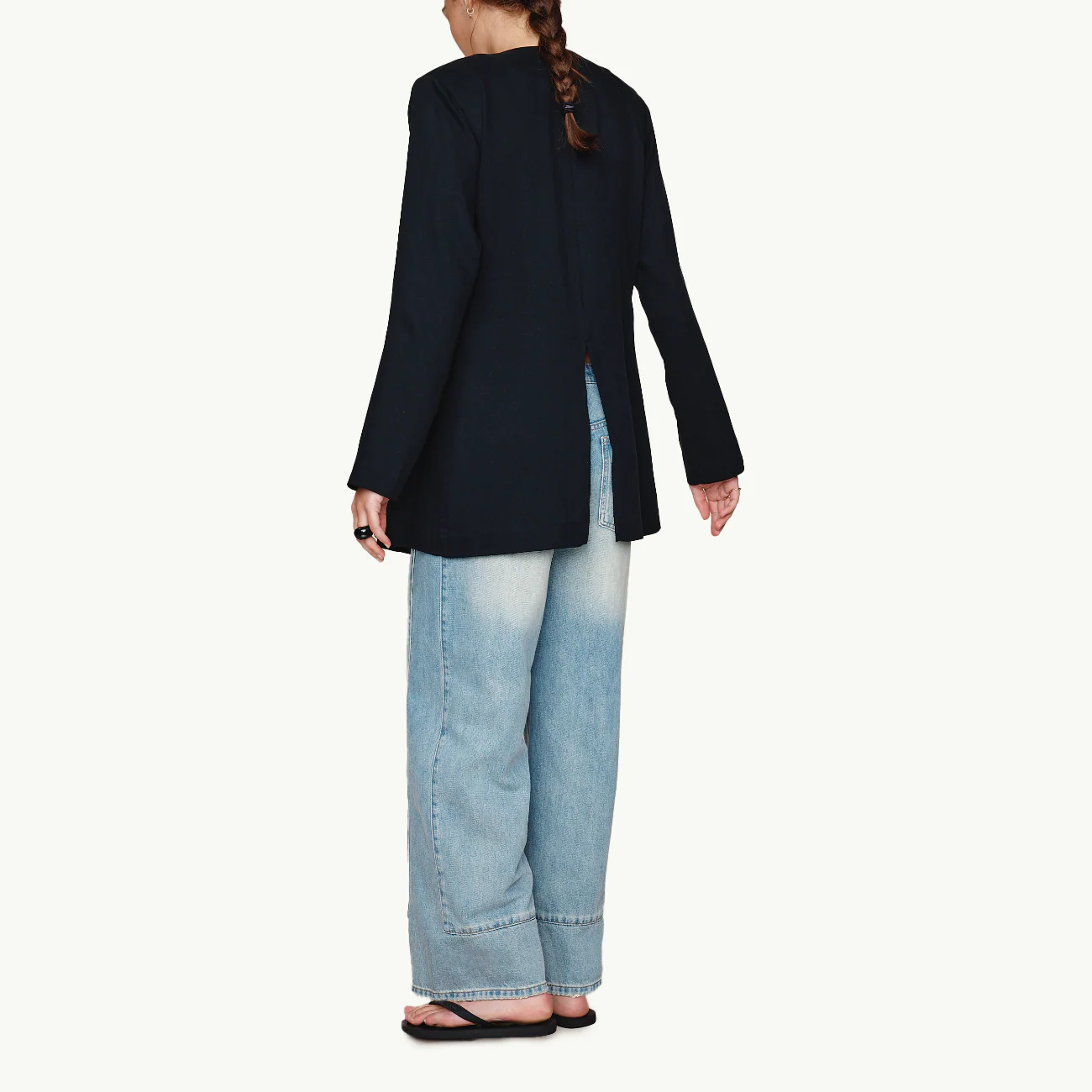 This longline jacket is crafted from a textured Tencel / Wool blend that offers a soft, structured drape. Designed with a clean, collarless neckline, it features a single covered button at the neck and an open front for effortless layering. The relaxed shape is refined with full-length sleeves and a centre-back vent, allowing ease of movement and enhancing the jacket’s fluid shape. This jacket is fully lined for a smooth, comfortable finish with subtle internal binding adding further refinement. A lightweight outer layer suitable for year-round wear.