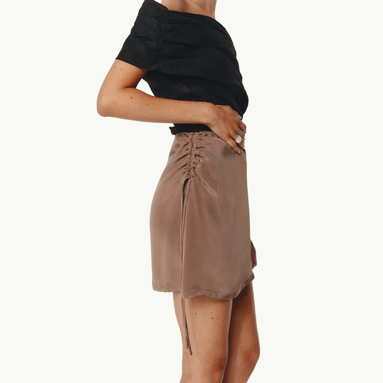 The Bia is built off the Iris skirt and features the same slim fit through the waist and hip, falling at a mini length. This skirt sits on a fixed waistband with an invisible zip closure at the side. On one side of the skirt, there is a gathered channel detail which can be adjusted and tied to the desired fit. This version of the Bia is crafted in a tencel / linen cloth.