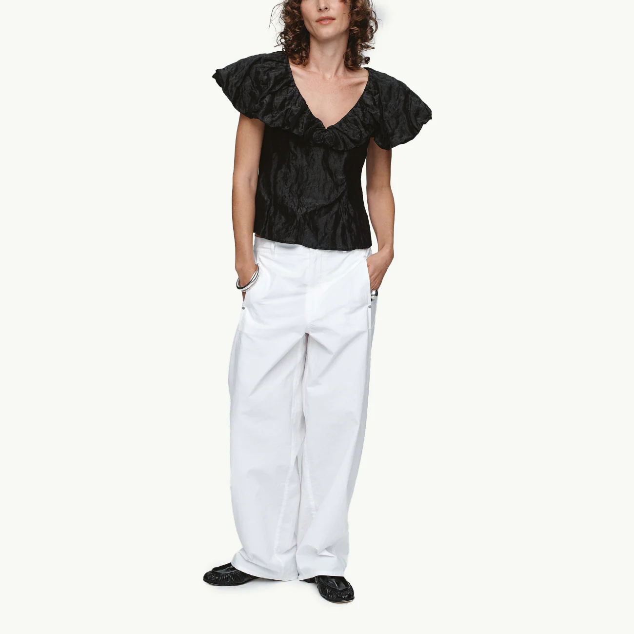 A sleeveless top constructed from a textured cotton / silk / metal fabric with a permanent crinkled finish. Cut with a fitted bodice and shaped seams for contouring. Features a wide, sculptural ruffle collar extending from the neckline and draping over the shoulders, creating soft volume and dimensional structure. Finished with a deep V-neckline and clean hem.