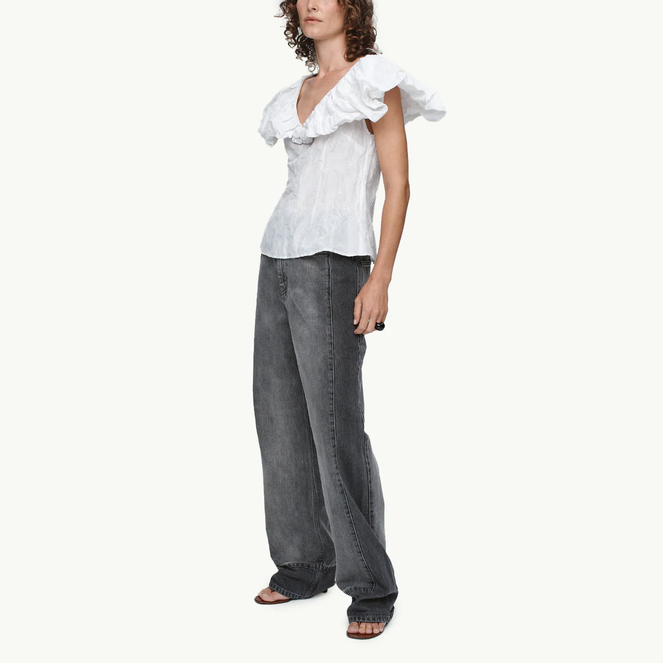 A sleeveless top constructed from a textured cotton / silk / metal fabric with a permanent crinkled finish. Cut with a fitted bodice and shaped seams for contouring. Features a wide, sculptural ruffle collar extending from the neckline and draping over the shoulders, creating soft volume and dimensional structure. Finished with a deep V-neckline and clean hem.
