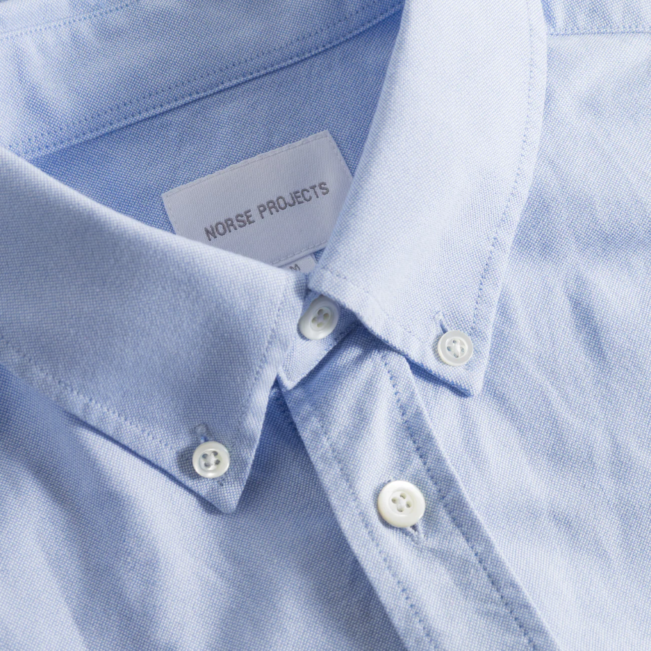The Norse Standard Oxford BD Shirt is inspired by the Ivy League look of the 1950s. This style features organic Oxford cloth, washed for a broken-in, authentic feel. Crafted in Portugal, it is finished with mother-of-pearl buttons and a button-down collar.